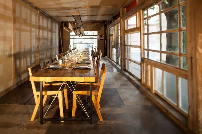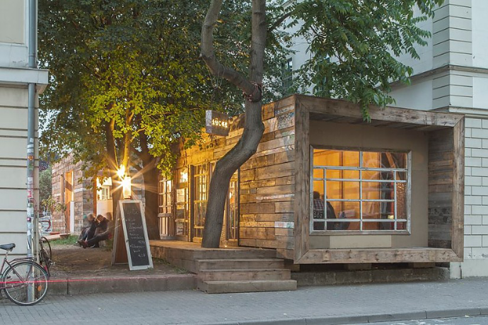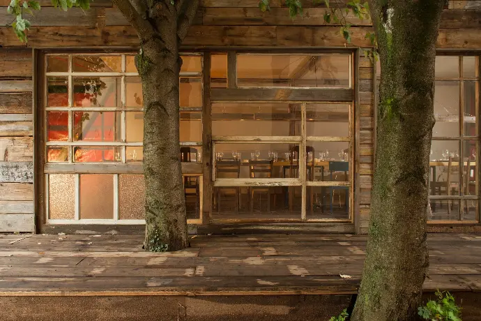 Abrissmaterial aufgearbeitet zu - einem Gebäude - einem Restaurant - einem Ort - an dem die Wiederverwendbarkeit von regionalen Ressourcen erlebt werden kann.